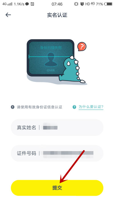 4、在实名认证页面输入我们身份证上面的姓名、证件号码,点击【提交】;