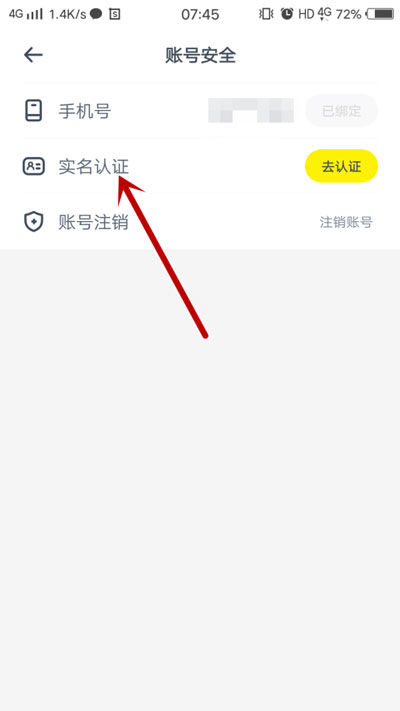 3、进入账号安全页面后,点击【实名认证】右侧的【去认证】;