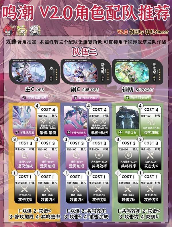 这是目前2.0版本中的T0级强力队伍,兼具输出和协同能力,适合追求高伤害的玩家。