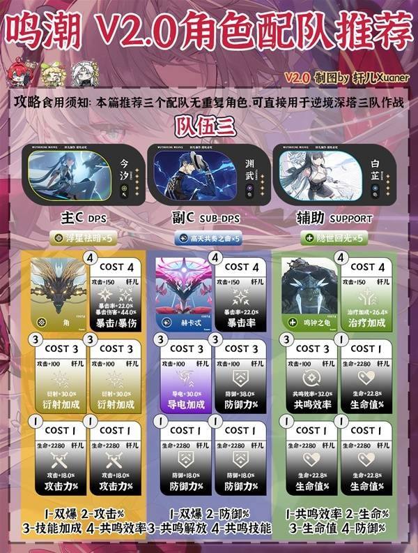 今汐依旧作为主C,渊武承担副C职责,白芷提供治疗和生存保障注意事项: