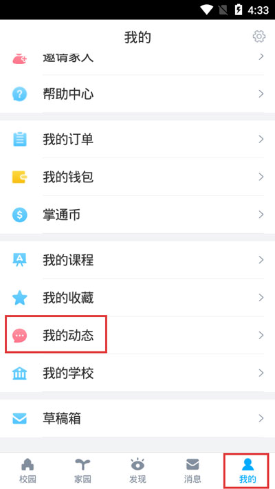 4、如果需要取消对个人用户的关注,也就是一些家长、老师的账号关注,进入【我也】页面,点击【我的动态】;