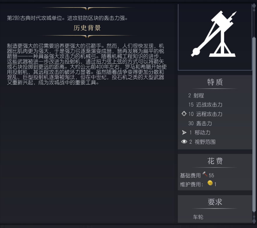 概要:第2阶古典时代攻城单位。进攻驻防区块的轰击力强。