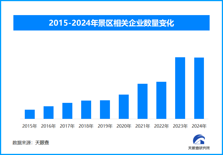 天眼查专业版数据显示,截至目前我国现存在业、存续状态的景区相关企业超46.1万家。其中,2024年截至目前新增注册相关企业约8.5万余家,从企业注册数量趋势来看,近十年间,景区相关企业的注册数量大体呈现出增长态势,并在2023年达到顶峰,为超8.6万余家。