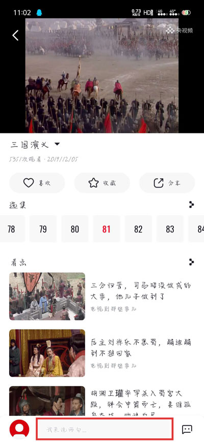 3、接着我们找到需要发评论的视频,以电视剧为例,播放视频后,点击最下方出现的输入框(如果是短视频,点击评论按钮,如果是横屏的视频,点击视频右下角的评论按钮即可);
