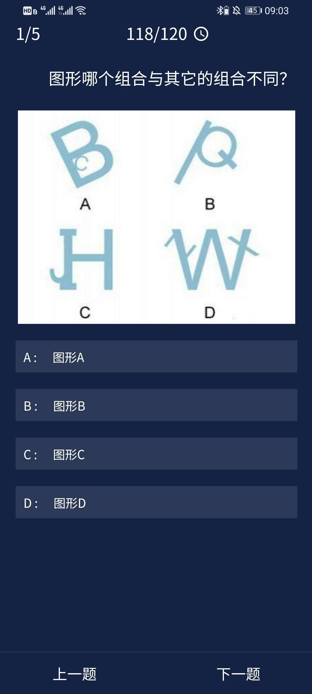 答案解析:A、B、C三个图形都是由连续关联三个字母组成的,分别是(B、C.D)(O、P、Q)(H、I、J)。