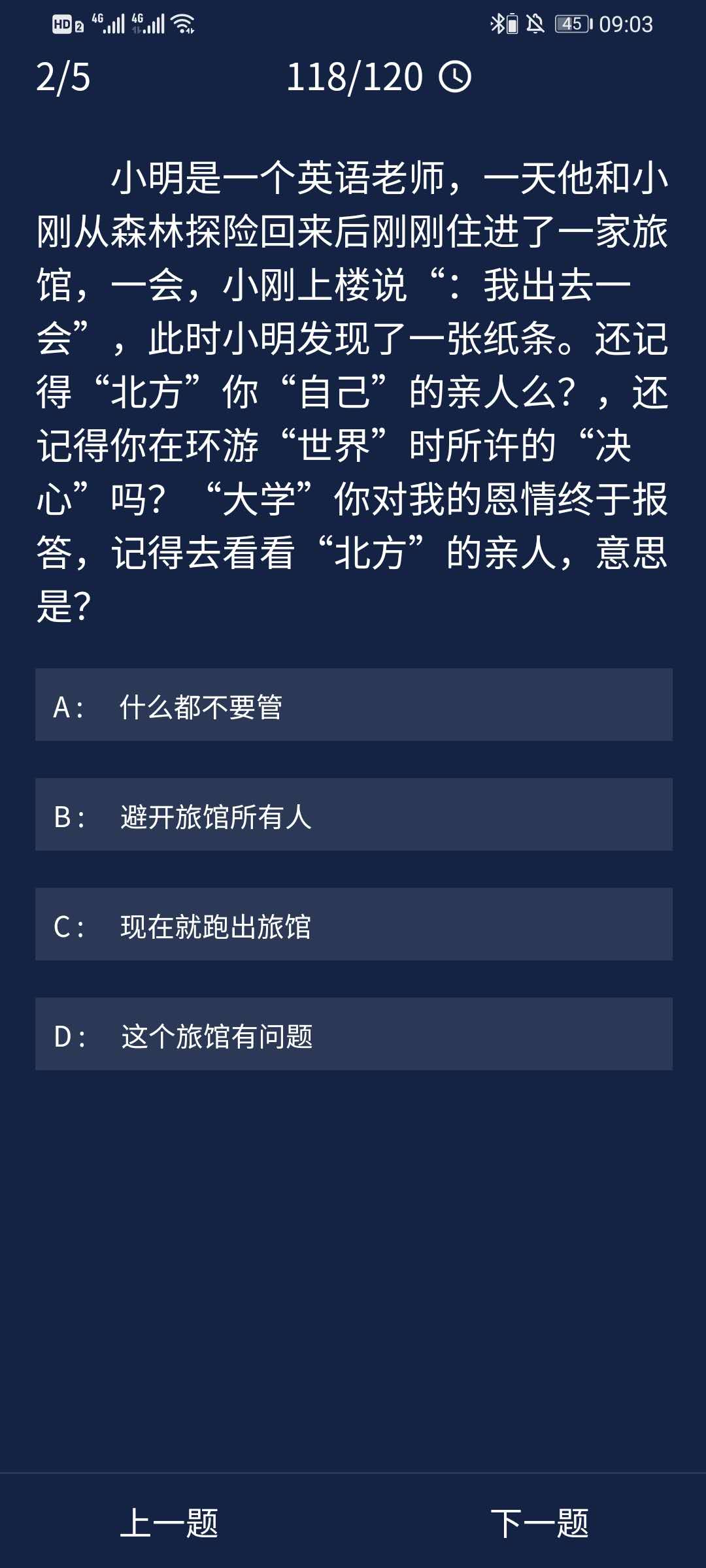 2、小明是一个英语老师,一天他和小刚从森林探险回来后刚刚住进了一家旅,小刚上楼说“:我出去一会”,此时小明发现了一张纸条。还记得“北方”你“自己”的亲人么?,还记得你在环游“世界”时所许的“决心”吗?“大学”你对我的恩情终于报答,记得去看看“北方”的亲人,意思是?