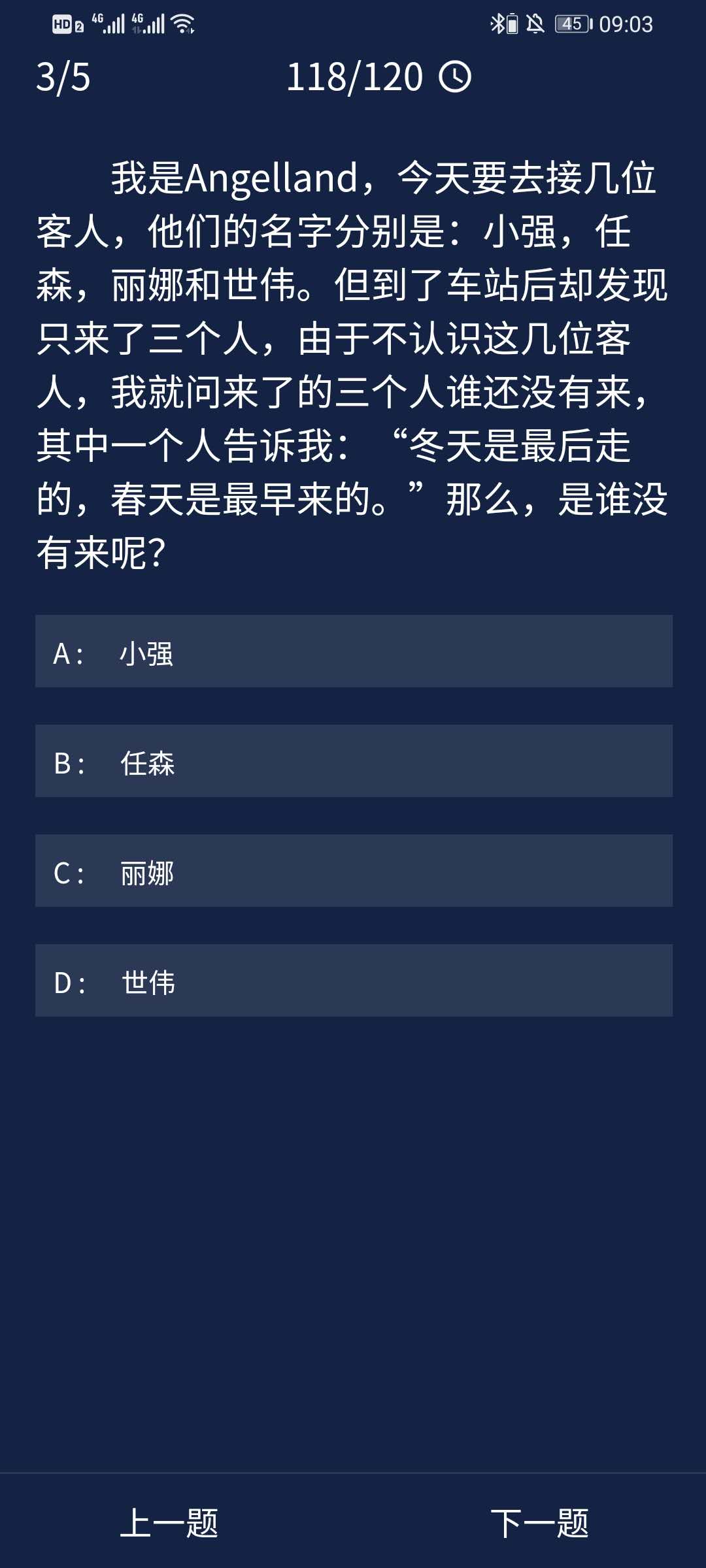 3、我是Angelland,今天要去接几位客人,他们的名字分别是:小强,任森,丽娜和世伟。但到了车站后却发现只来了三个人,由于不认识这几位客人,我就问来了的三个人谁还没有来,其中一个人告诉我:“冬天是最后走的,春天是最早来的。”那么,是谁没有来呢?