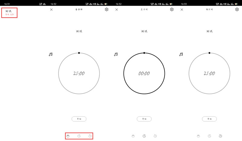 5、添加的时间,可以点击进入专注模式,【开始】即可开启时间倒计时,在下方可以切换番茄钟、正计时、倒计时等多种模式;
