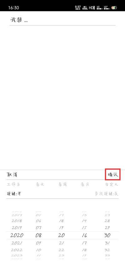 4、点击右上角的【时钟】可以设置该事件的提醒时间,以及是否开启提醒,和是否多次提醒,点击【确定】完成事件添加;