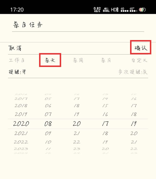 3、接着设置每天的任务提醒时间,在上方选择重复提醒的类型为【每天】,最后点击【确认】保存事件;