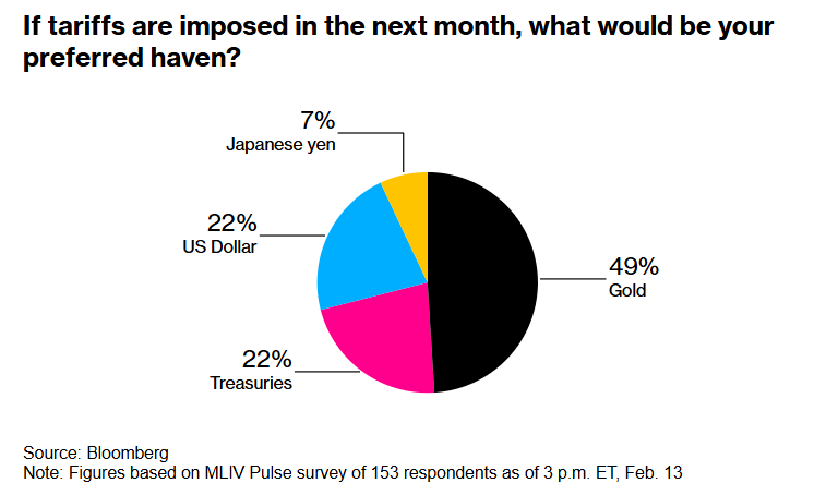 然而,如果短期内美股波动加剧,一些市场参与者可能会对转向政府债券犹豫不决。在接受调查的投资者中,只有22%的人认为美债是未来一个月首选的避险资产。黄金是目前为止最受欢迎的选择,49%的投资者表示,如果市场出现动荡,黄金将是他们的首选去处。