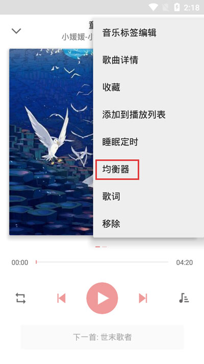 5、我们还可以通过音乐播放页面打开均衡器,点击右上角的三个点【更多】,选择【均衡器】即可;