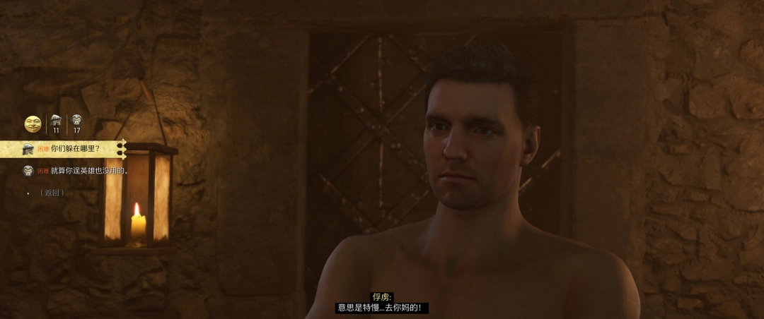 2:【必要之恶】审问时必须在“关于你的营地”选项通过威逼和胁迫,让囚犯说出强盗窝点在内巴科夫,参考我的属性,威逼11每次都会失败,胁迫17每次都成功(已获成就【老乌鸦】那么你已经知道了窝点了在内巴科夫了,审问的时候可以随便问)