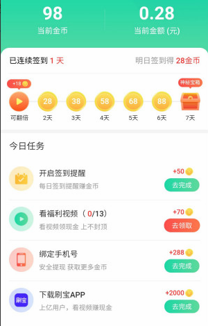 除了走路步数换金币赚钱之外,还有一些任务、签到啥的,不过收益都很低,10000金币=1元。