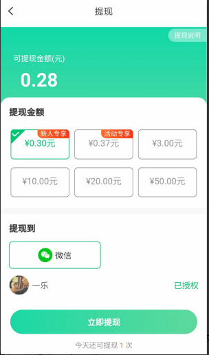 新人专享0.3元提现权利,可是这个没法提现,只有0.28元,金币要次日O-6点才会自动转换成现金,然后提现。