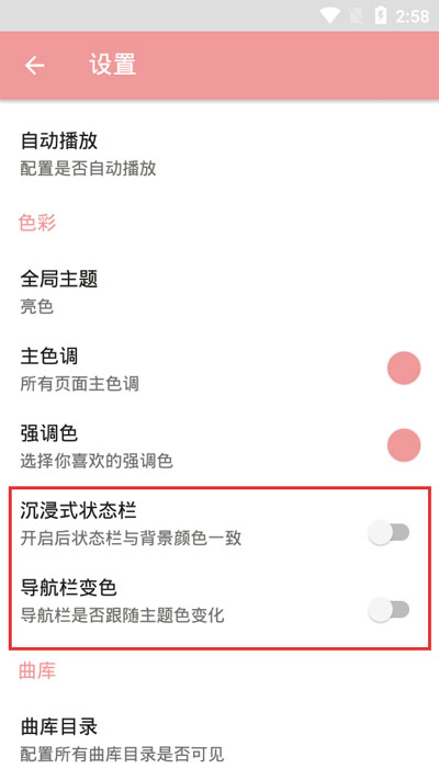 10、修改玩强调色之后,同时还可以开启下方的【沉浸式状态栏】和【导航栏变色】功能,将状态栏和导航栏修改成主题色;