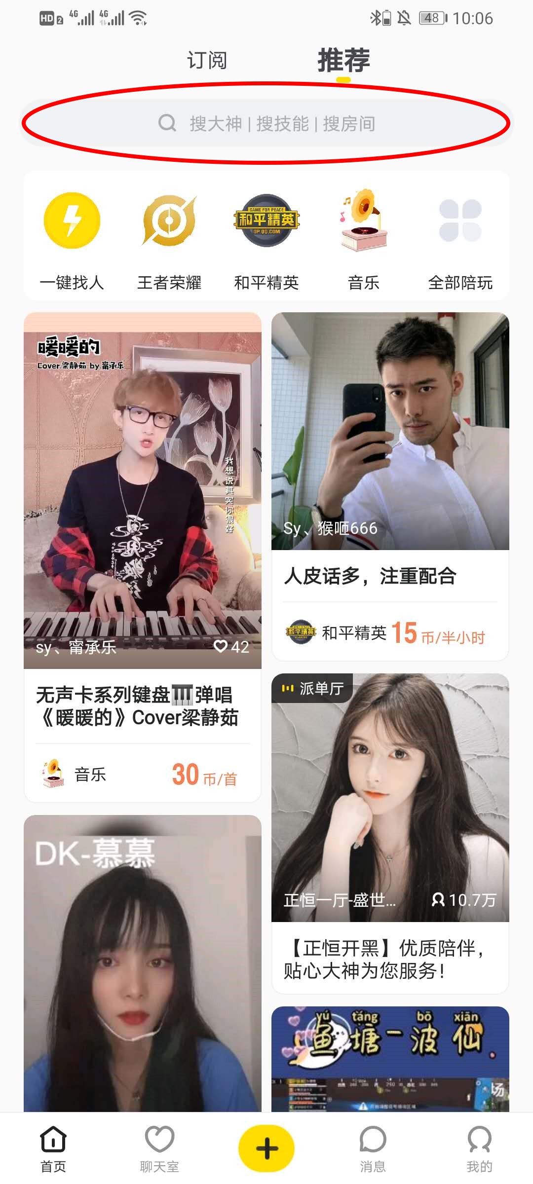 1、打开小鹿陪玩,在首页点击上方的搜索框,搜索想找的游戏陪玩。