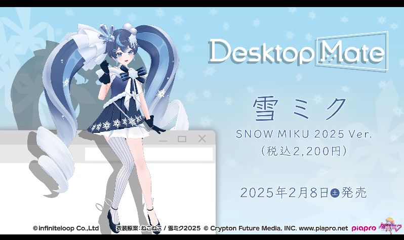 《Desktop Mate》的DLC“SNOW MIKU 2025 Ver.”还将在“SNOW MIKU 2025”北海道小樽市的活动现场展出,游戏预计于2月8日上午九点上线,售价2200日元,玩家需先下载游戏本体才能购买。