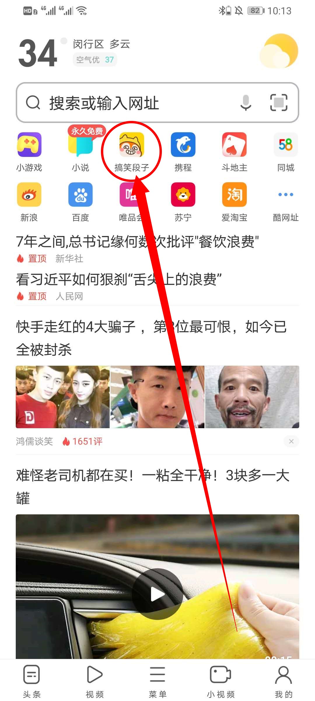 1、打开uc浏览器,在首页点击上方的搞笑段子(正经部更名为搞笑段子),进入界面。