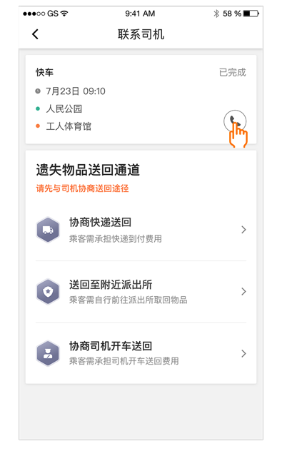 “协商司机开车送回”方式在每日8:00-22:00开放,乘客需先与司机沟通,确定物品遗落在车上,协商一致后,可反向发单。在功能页填写送回地址,预支付从司机所在地到乘客目的地的送回费用,确定发单,司机接单送回,现场验证乘客身份、交付物品后,平台会将乘客预支付的费用全额交付司机。在此过程中,滴滴平台分文不取。