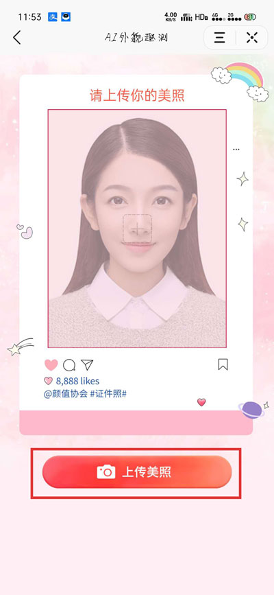 4.点击【上传美照】选择一张自己的照片,注意照片必须要露出正脸、单人照片、脸部无遮挡;