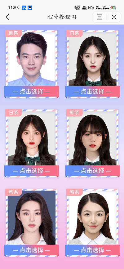 3.Ai外貌趣测小程序提供很多类型的证件照,选择自己喜欢的证件类型;