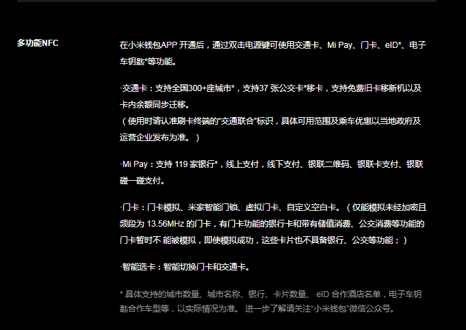 ·Mi Pay :支持119家银行*,线上支付,线下支付、银联二维码、银联卡支付、银联碰一碰支付。