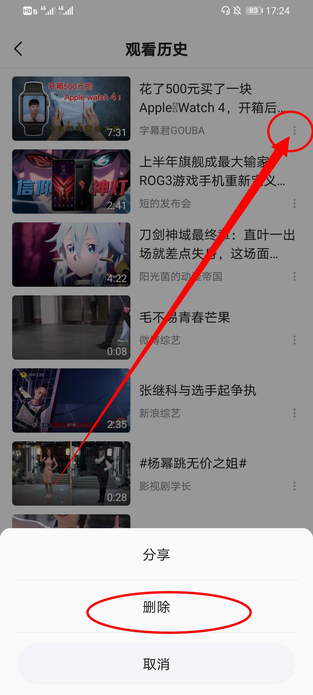 3、在观看历史界面,点击想要删除的视频记录右下方角的位置,在弹出界面中点击删除即可。