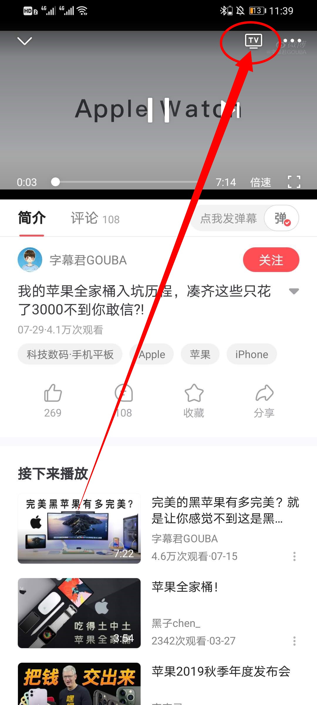 2、在视频播放界面,点击视频右上方的TV,点击进行投屏。
