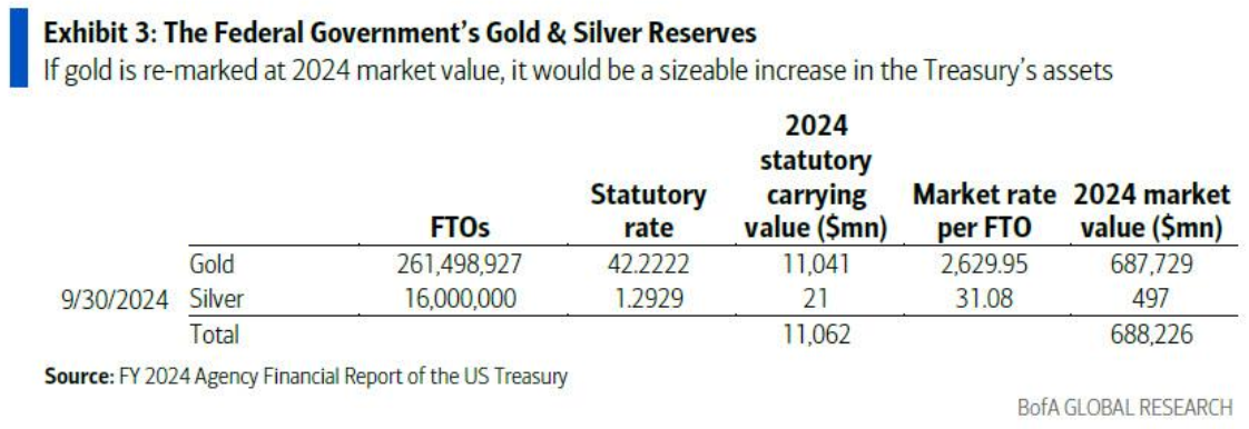 这是以1973年尼克松切断美元与黄金之间最后联系时依法确定的每盎司42.22美元的静态价格为基础的。这一黄金价格被称为“法定汇率”。根据最新的财政部机构财务报告,如果财政部对其黄金进行重新标记,2024年的市场价值将为6880亿美元。这意味着财政部的资产将增加6770亿美元。