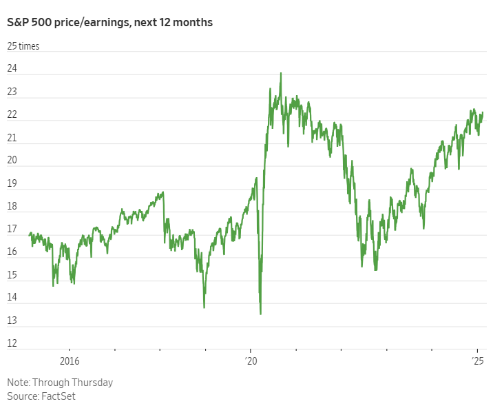 根据FactSet的数据,标普500指数未来12个月的远期市盈率高达22倍,高于19倍的10年平均水平,与2000年互联网崩盘前的26倍相近。