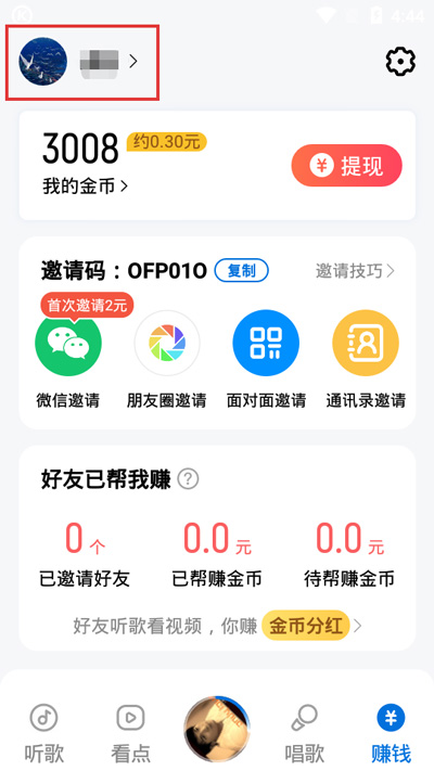 2.然后在赚钱页面点击最上方的【个人头像】或者【昵称】进入个人中心;