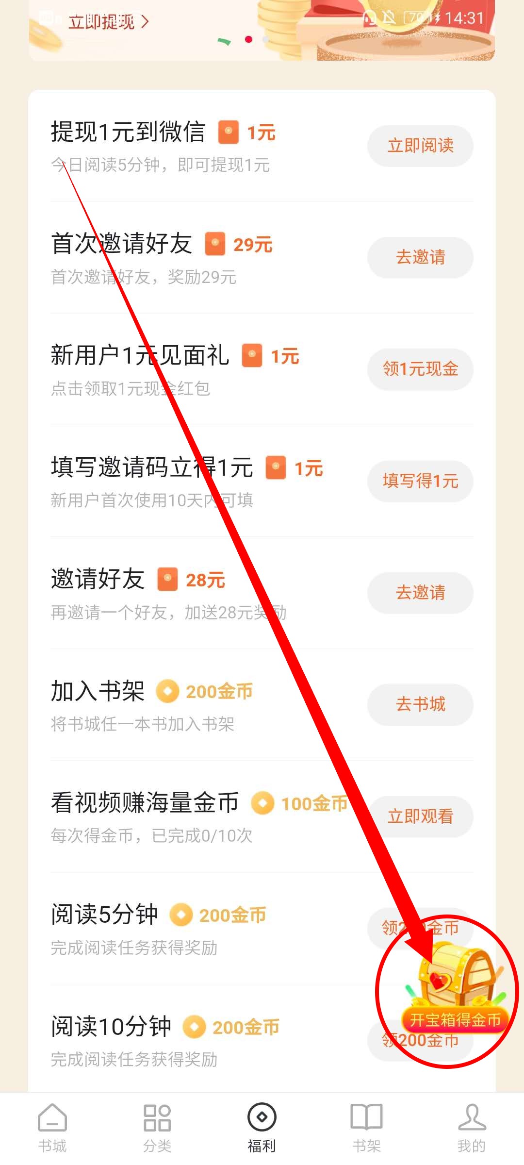 3、在福利界面点击开宝箱获得金币兑换现金。