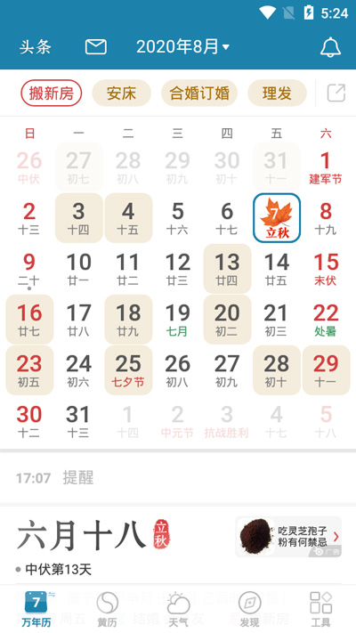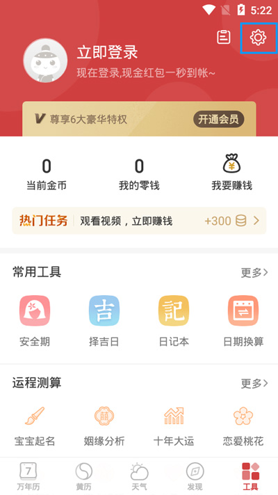 1.打开手机中的万年历APP,在下方的功能栏中点击【工具】进入我的页面;