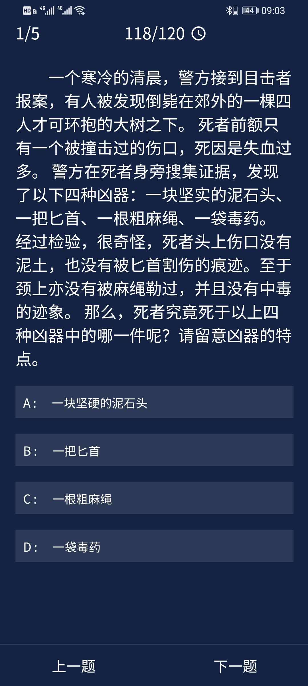 答案解析:这四件凶器若只有一件可以置人于死地,只能用“排他法”解决。首先,死者没有被勒过的痕迹,又不是窒息而死,那么绳子可以排除。死者没有中毒,所以那袋毒药也可排除掉。至于“撞击”是致命之处,可以说泥石头的嫌疑最大,可是死者伤口上没有泥土,所以泥石头应该可以排除掉。剩下来是匕首,因为死者身上没有刀伤,所以最后可以肯定的是凶手是用匕首的柄部撞击死者,匕首是“真正”的凶器。