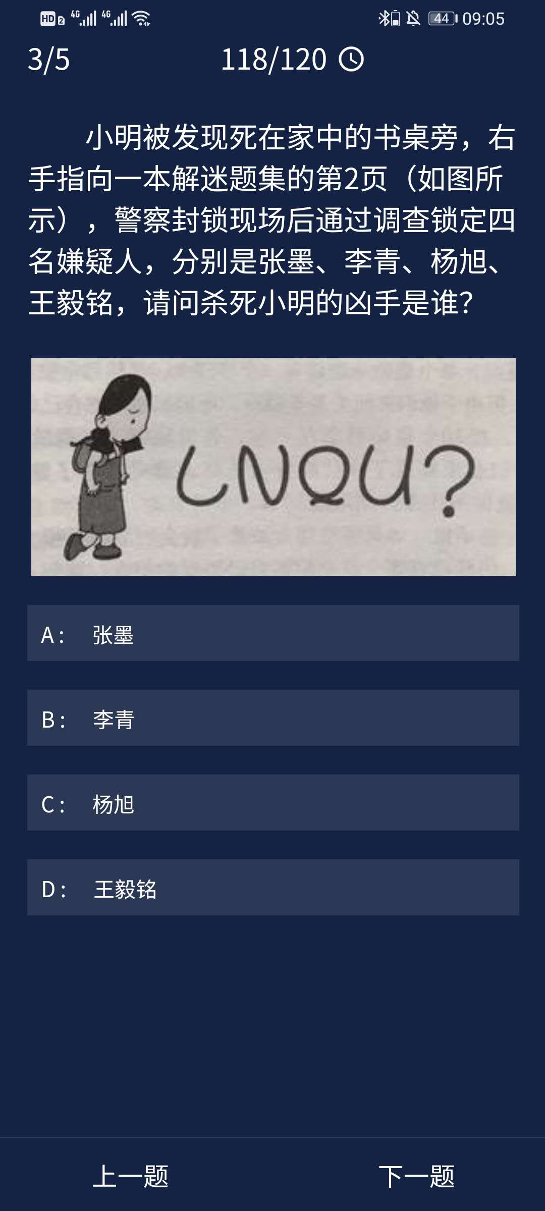 3、小明被发现死在家中的书桌旁,右手指向一本解迷题集的第2页(如图所示),警察封锁现场后通过调查锁定四名嫌疑人,分别是张墨、李青、杨旭、王毅铭,请问杀死小明的凶手是谁?