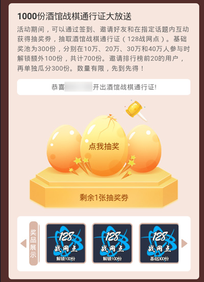在活动期间,通过签到、邀请好友和在指定话题内互动获得抽奖券,抽取酒馆战棋通行证(128战网点)。基础奖池为300份,分别在10万、20万、30万和40万人参与时解锁额外100份,共计700份。邀请排行榜前20的用户,再单独瓜分300份。数量有限,先到先得!