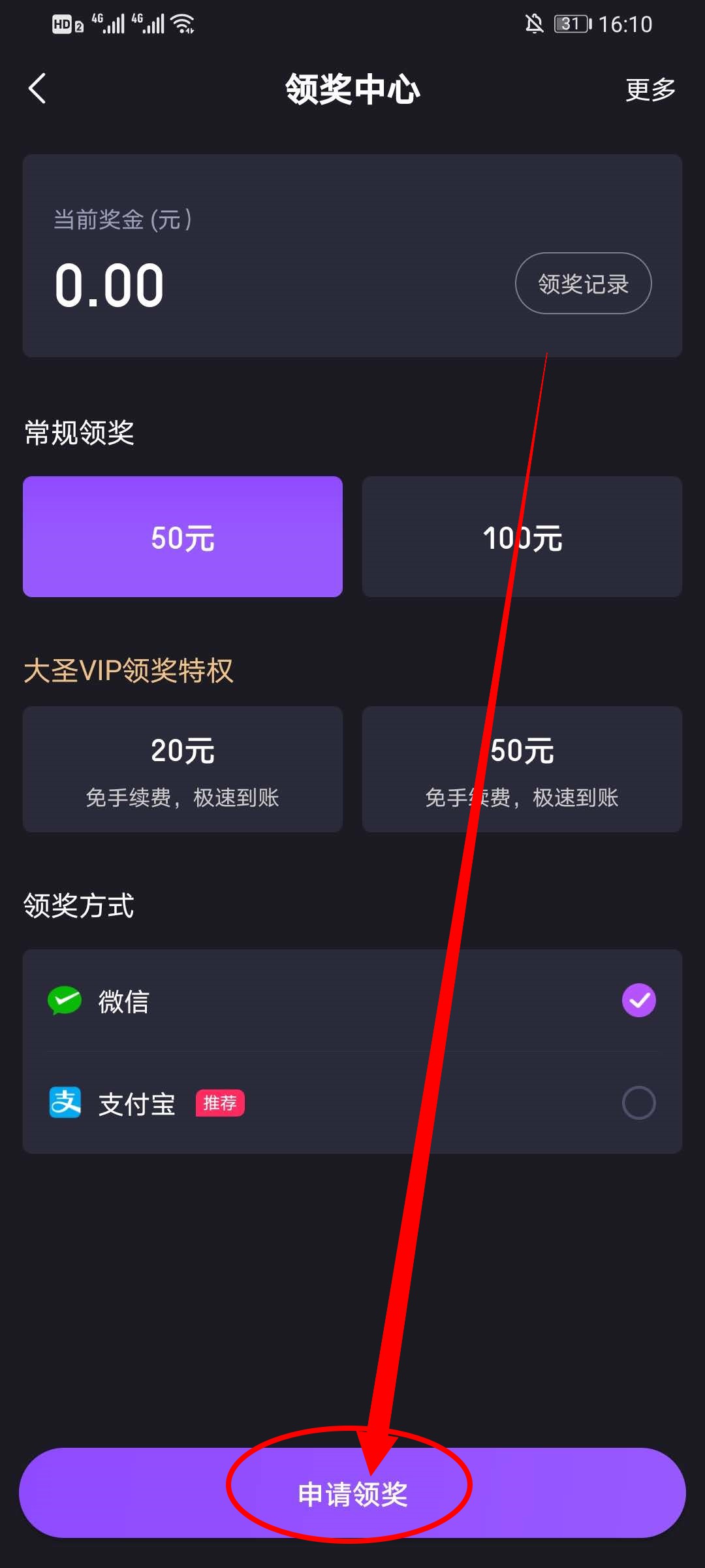4、在领奖中心,点击下方的申请领奖进行提现。