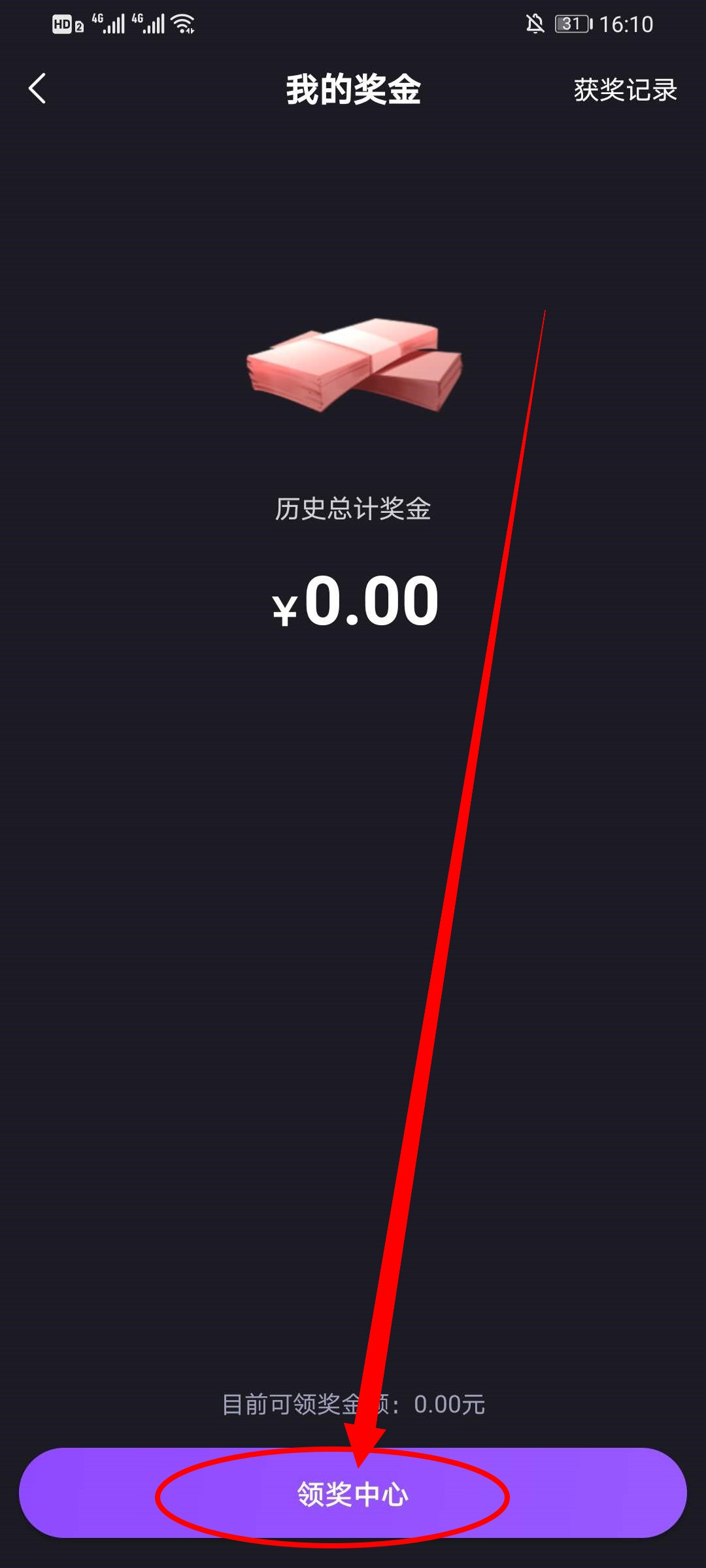 3、在奖金界面,点击下方的领奖中心,进入领奖界面。