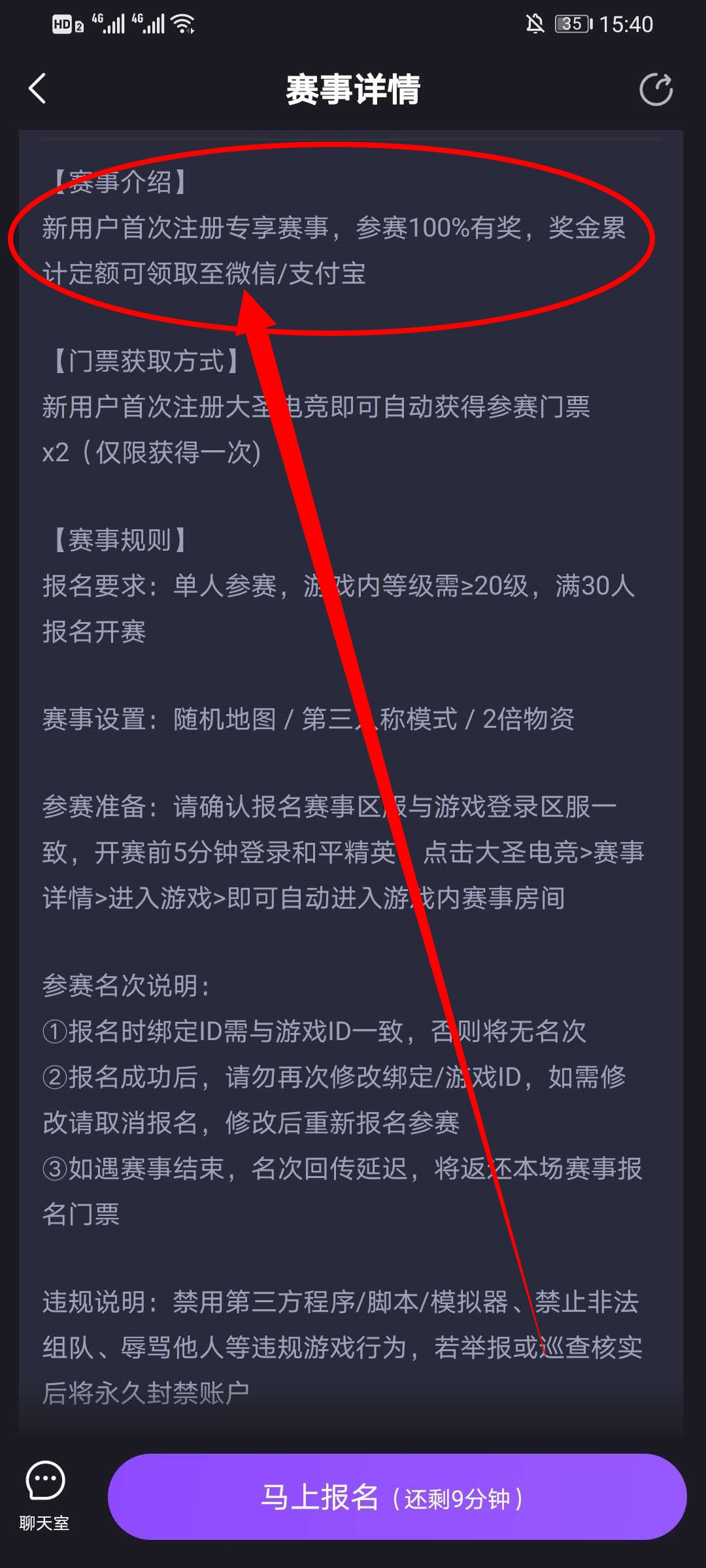 新用户首次注册专享赛事,参赛100%有奖,奖金累计定额可领取至微信/支付宝