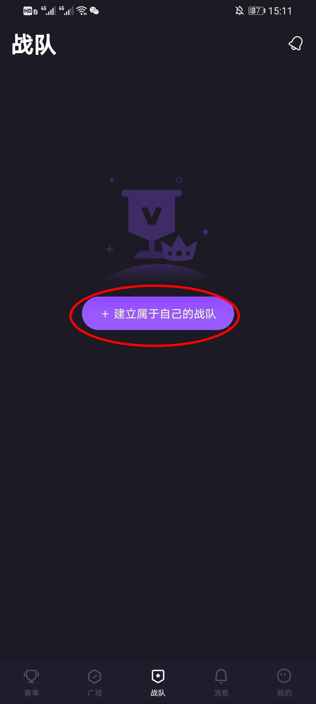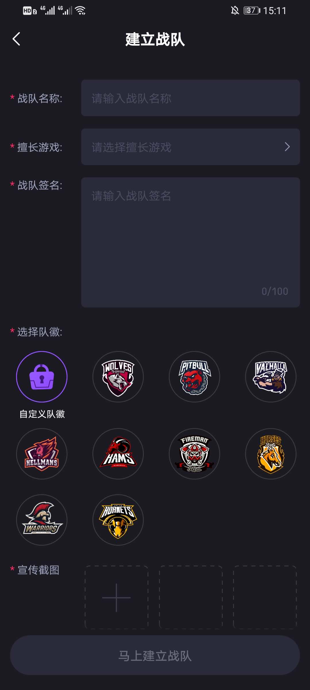 2、在战队界面,点击中间的创建战队,进入战队信息填写界面。