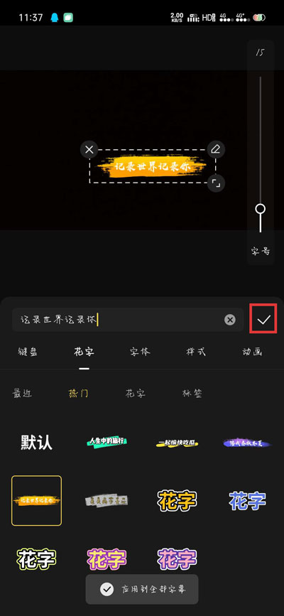4.输入我们需要添加的字幕内容,然后选择字体的样式、字体、花字、动画等等,编辑完成后,点击右侧的【完成】;