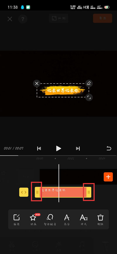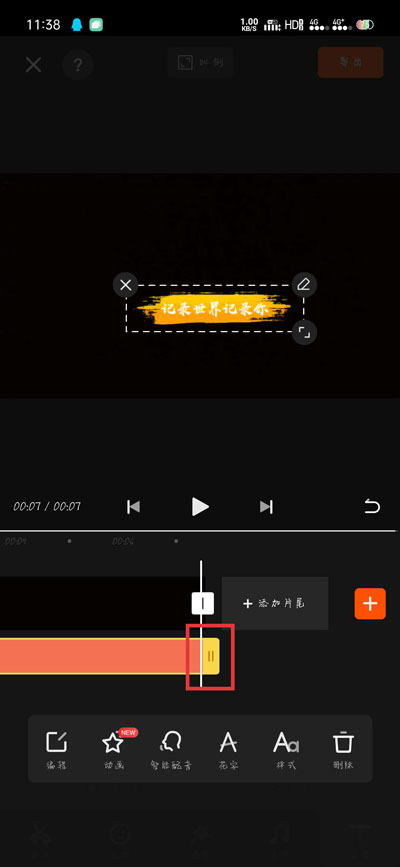 5.之后,在时间段位置,可以看到当前字幕出现的时间只有一小段,想要一直保持不消失,拉动字幕的时间段;