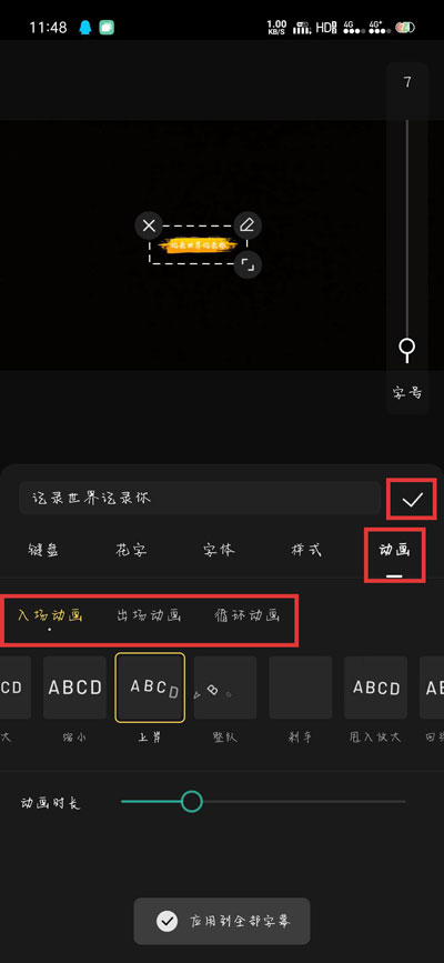 4.之后在动画中选择字幕的入场动画、出场动画、循环动画,在动画中选择动画样式为一个一个字出现的动画,点击右上角的【完成】;