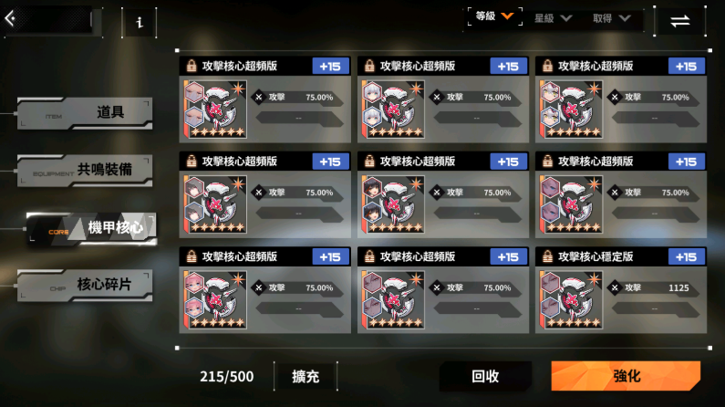 5.核心:后期养成内容,可以给角色提供大量属性加成,但是需要巨量的体力投入,前期不推荐在此方面投入过多资源。后期每天清体力以及双倍资源活动,建议全来刷核心,先让一套阵容满配。
