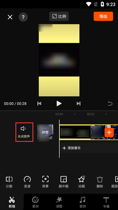 3.在导入视频之后,我们可以在中间的视频时间段左侧看到,有个【关闭原声】功能,点击即可关闭视频的原声;