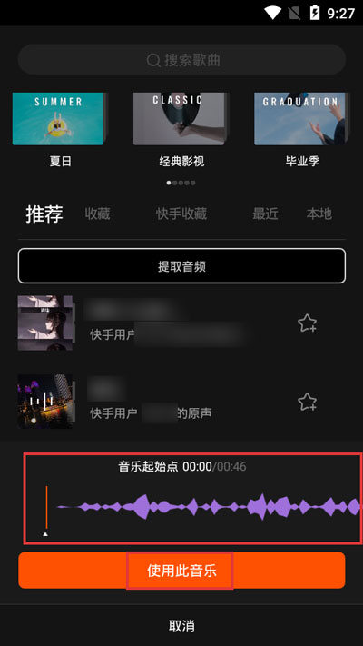 7.在添加音乐页面,选择或者搜索想要应用的背景音乐,点击音乐好,选择音乐的起始点,点击【使用此音乐】;