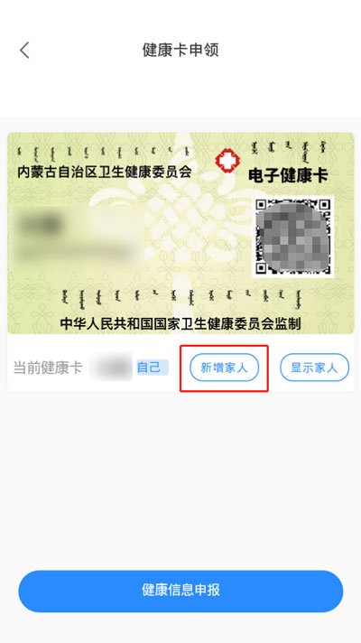 3.进入健康卡申领页面后,点击我们的健康卡下的【新增加人】添加小孩的健康卡;