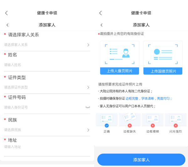4.在添加家人页面,输入小孩的身份信息,上传小孩的身份证照片,如果没有身份证,则上传小孩的户口本页面照片,点击【添加家人】;