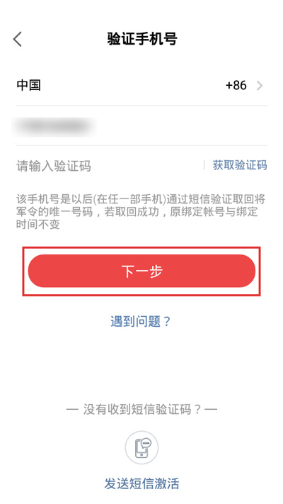 3.由于我们没有绑定将军令,需要先进行手机号码验证,输入手机号码(该手机号码是取回将军令的唯一号码),短信验证码,点击【下一步】;